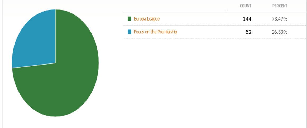 Well the results were pretty conclusive… and as 196 of you voted which was a fair amount to make a conclusion on I reckon! Roughly 73% of the vote went towards being in the Europa League compared to 27% opposed. Obviously looking back I should have made it more obvious that focus on the Premiership meant also of course the FA cup and League Cup… the poll was more meant to be as to whether you thought the Europa League would be a distraction.