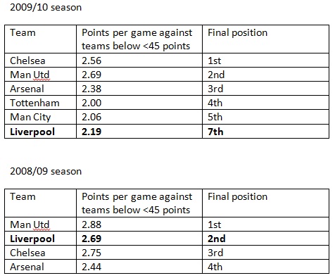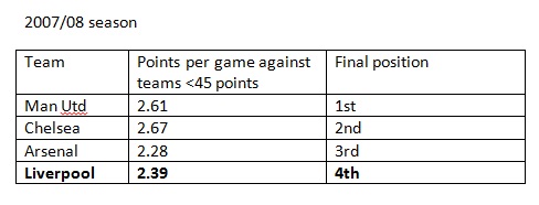 The methodology I used is rather straightforward – I simply calculated the number of points Liverpool and other teams finishing above 65 points gained against teams finishing with less than 45 points. I did this from 2007-08 season onwards to the current season. I included Liverpool in all seasons (even if we might not have finished above 65 points in some seasons), as it is the club under our scope of study.