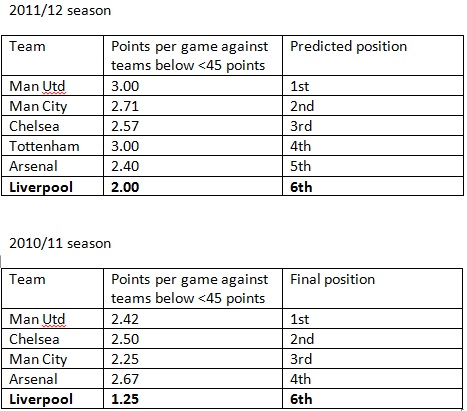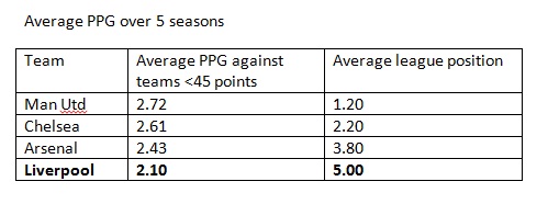 From the above, it is evident over the past 5 seasons that the greater the number of points you pick up against ‘relegation fodder’ sides (of below 45 points), the greater your chances of having a higher league finish. It is without doubt that the likes of Chelsea and Manchester United have been remarkably consistent against these lower-ranked sides, something that Liverpool, and to a certain extent, Arsenal, haven’t been able to replicate.
