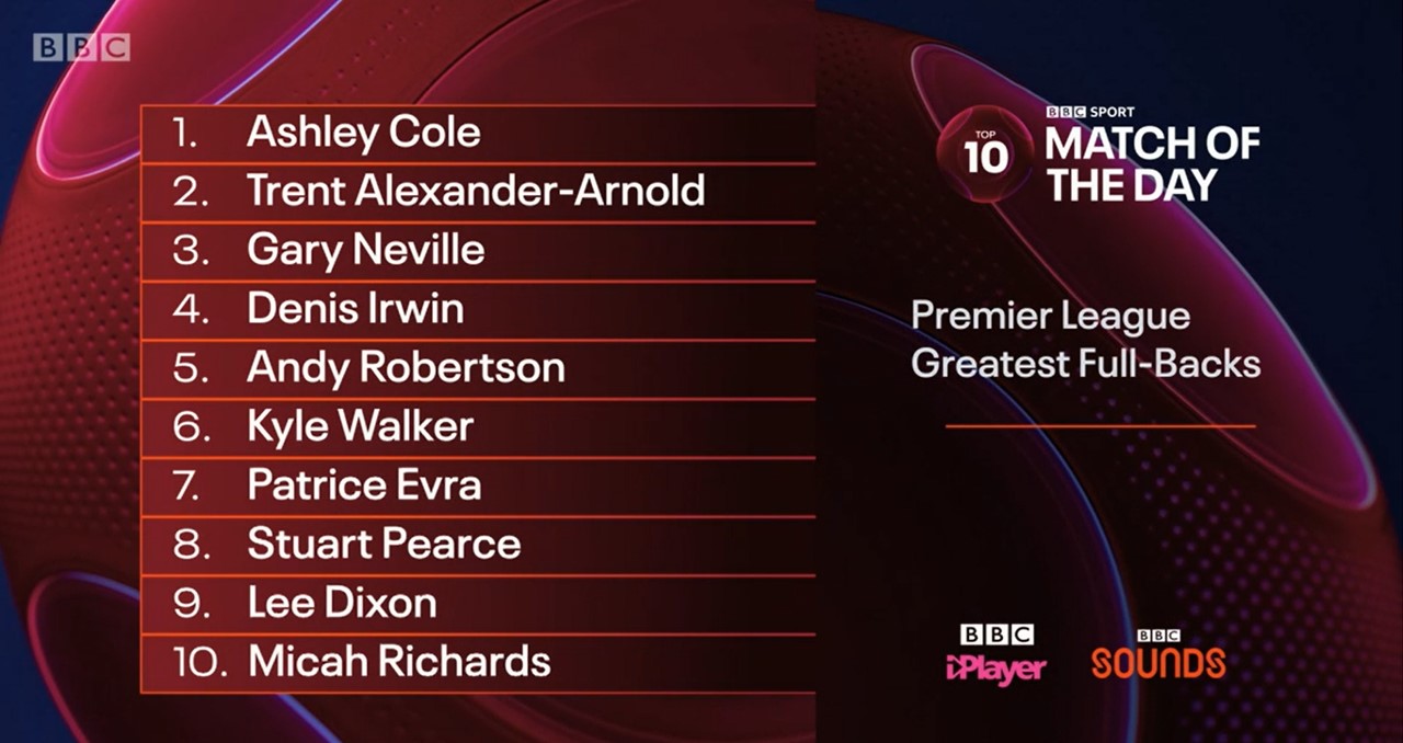 Andy Robertson was placed in fifth position before it was revealed that Trent Alexander-Arnold was voted as the second-best, behind only Ashley Cole.