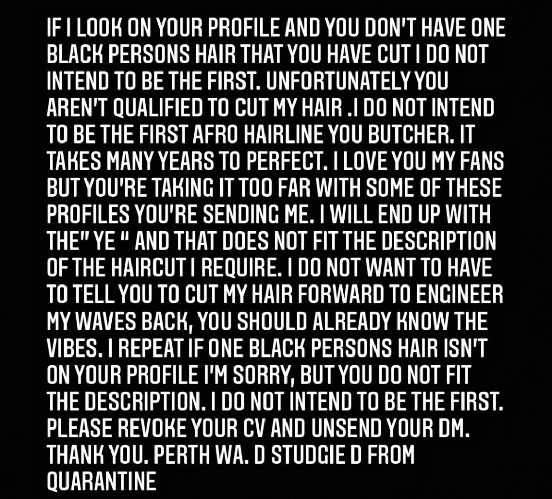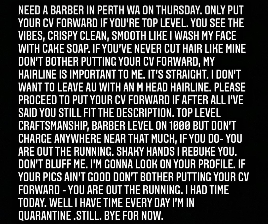 In a two-part Instagram story, the 32-year-old has asked for help so that he can find someone with ‘Barber level on 1000‘ for when he is finally allowed to leave his isolation.